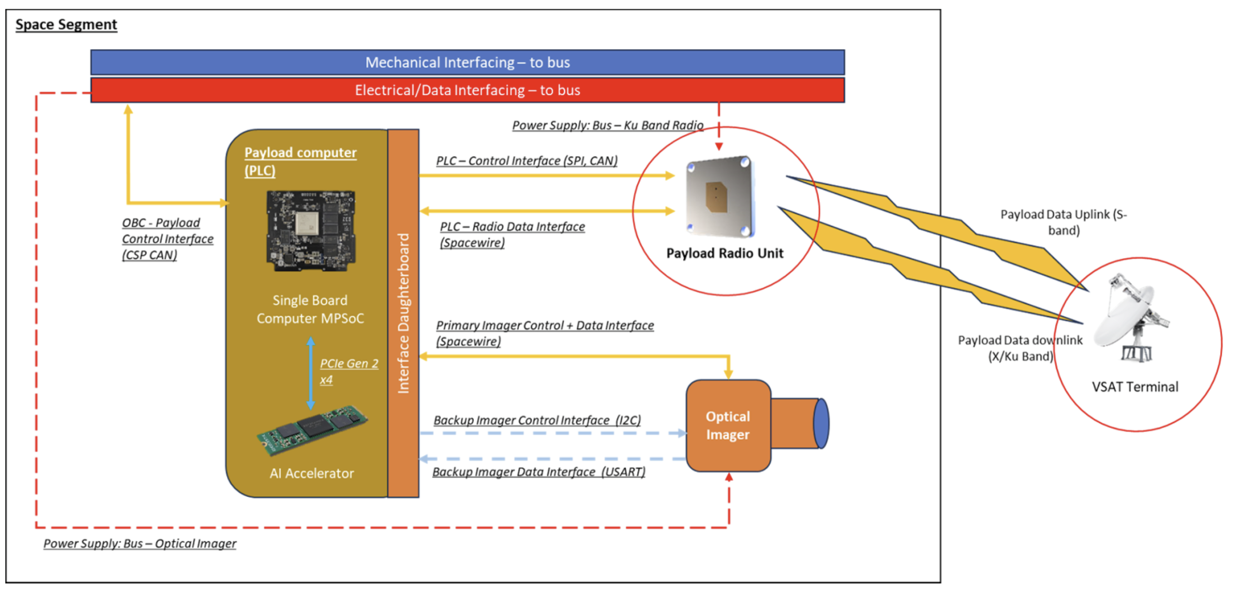 Payload Computer (PLC): MPSoC-based single-board computer integrated with an AI accelerator (PCIe Gen 2 ×4).