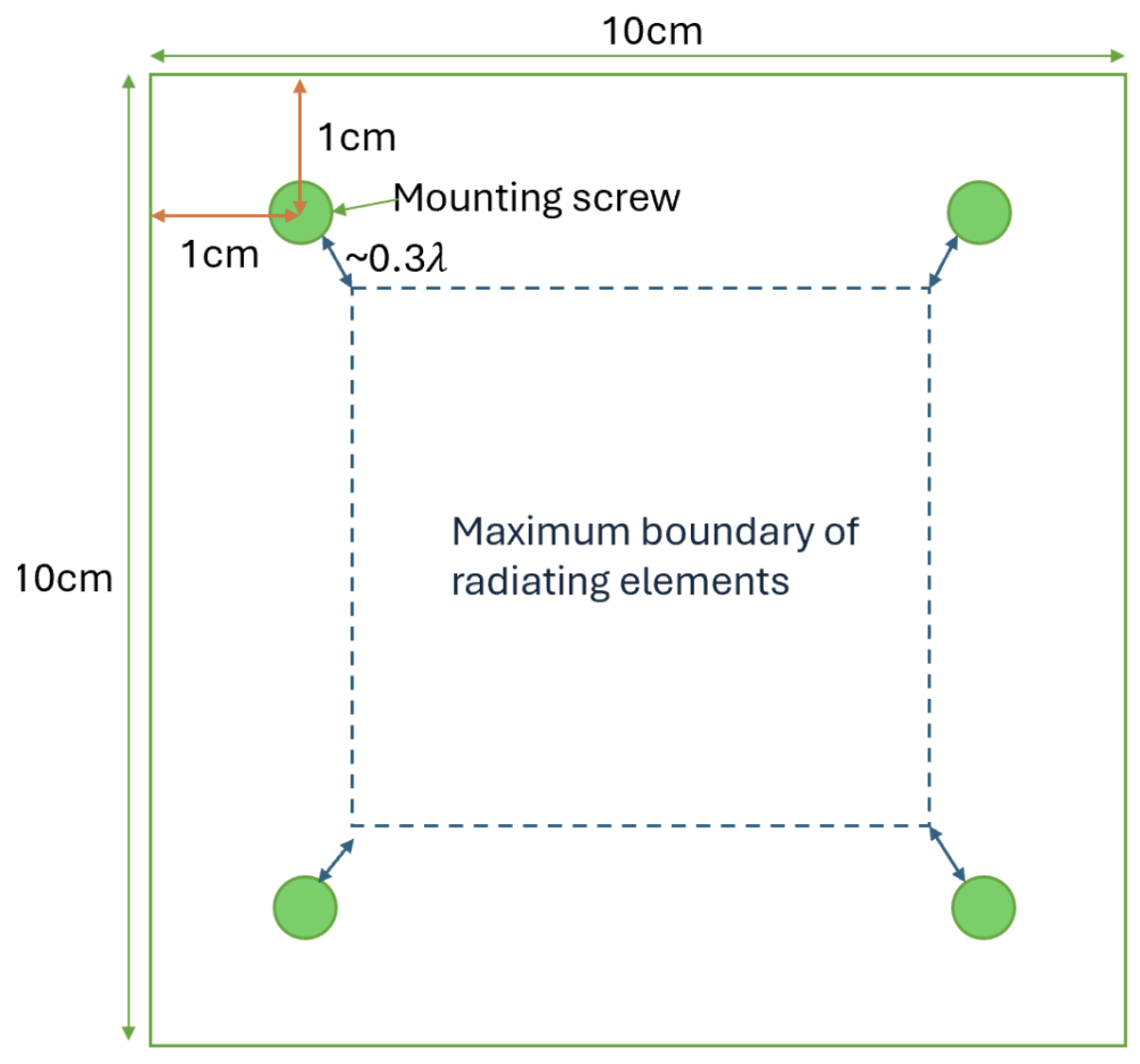 The central frequency, gain and beamwidth were set by the team lead-cum-system engineer. From discussions with the mechanical team, the mounting of the antenna was determined to be on a 1U (10cmx10cm) face of the CubeSat. Similar to Gomspace’s S-band antenna ANT2150 (lit), the mounting screws will be at 4 corners of the 1U face. A minimum distance of 1cm from the face edges is set for mechanical stability. Factoring in the antenna’s radiating elements will need ~0.3 wavelength (depends on antenna substrate to be chosen) separation from metal, this gives maximum space for the antenna’s radiating elements.