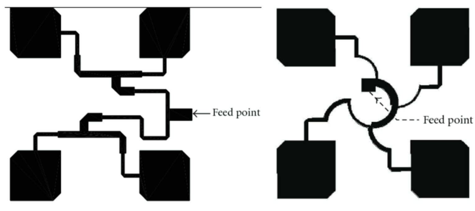 There are 3 main techniques. The first is a compact approach utilising a single-point feed combined with deliberate geometric perturbations - such as truncating the opposing corners of a square patch or introducing asymmetrical slots. The second is a dual-feed approach, which employs an external power divider network to feed two orthogonal edges of the patch with the required phase shift. These structural modifications intentionally detune the degenerate modes of the symmetrical patch. This forces the fundamental mode to split into two orthogonal components that naturally achieve the necessary in-phase quadrature (90-degree phase shift) required to radiate circularly polarised waves (Helit Team, n.d.; Orban & Moernaut, 2005). The third technique is to make a sequentially-rotated 2x2 array of a linearly-polarised single patch. In this technique, four elements in a 2x2 array are physically rotated and excited with sequential phase shifts of 0°, 90°, 180°, and 270° (Kuhlmann, 2023) (Fig x).