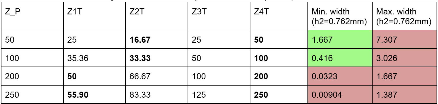 For the lower substrate height h2, this will be similar to h to reduce PCB warping, as unequal dielectric thicknesses can induce mechanical stress during lamination, leading to severe board deformation (Adrian, 2025; Cadence PCB Education, 2025). h2 will affect the trace widths of the feed network. The feed network will consist of 50 Ohm, 70.7 Ohm quarter-wave transformers and possibly lower impedances, due to the need to split the power source to 4 feeds or more. Due to the small area of the patches, the feed positions will also be close together, which means the feed network would need to be compact and thus the trace widths cannot be too wide, as it would lead to field leakage and coupling to neighbouring traces or feed points. The widths must also not be too small to introduce large manufacturing tolerance errors. Thus, h2 will be further tuned after more simulation.