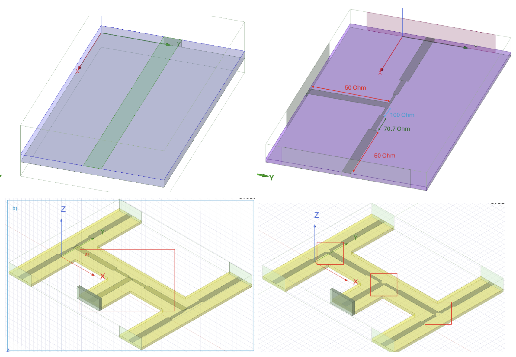 Using this trace width, I created the T-junction (Fig. x) which splits the power into two feeds of 50 Ohm characteristic impedance each. This is done by first splitting the starting feed (50 Ohm) to two 100 Ohm lines, each transformed via a quarter wavelength 70.7 Ohm line (Appendix for formula) to 50 Ohm.