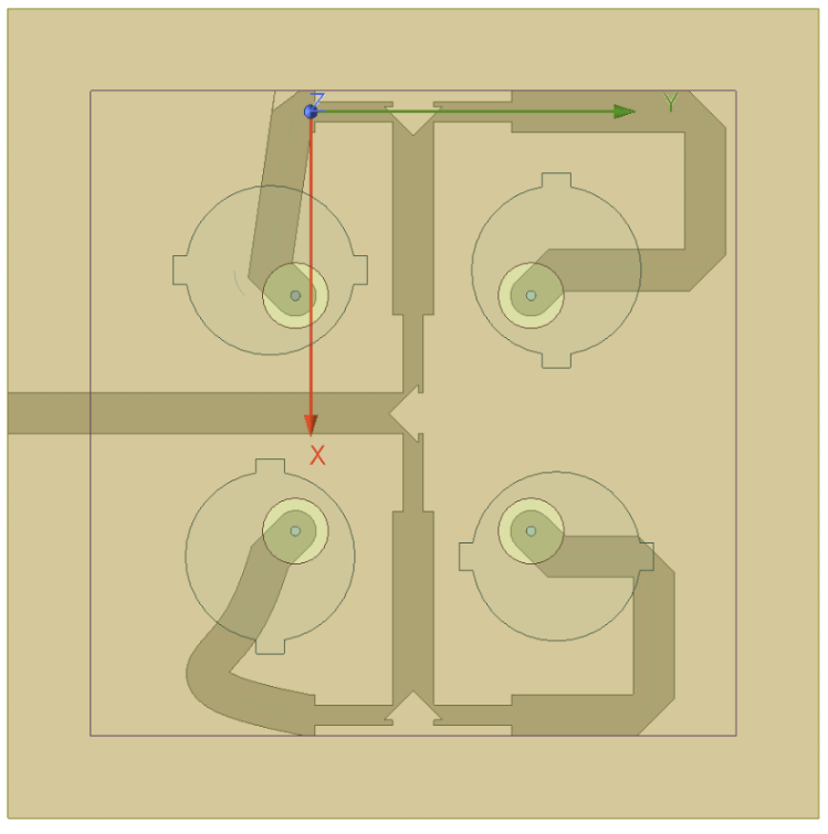 However, to create the 2x2 array, we need to excite each of 4 patches at 90 degrees phase difference which requires a feed network. If a complex feeding network were implemented on the same layer as the patches, it would generate undesired spurious radiation, which could affect the antenna’s overall performance and S11 (Minz, Kang, & Park, 2020). Thus, also accounting for the probe-fed design, a feed network must be designed on a 3rd layer. There are two options. It can either be a microstrip line or a stripline. A stripline is a signal trace sandwiched symmetrically between two substrate layers and two ground planes (Fig. x) (“A comparative study”, 2016). From my research, stripline would cause more losses so it was rejected. While this fully enclosed structure prevents radiation leakage, striplines can introduce higher losses (“A comparative study”, 2016). Furthermore, a stripline requires a more complex, heavier multi-layer fabrication process. Therefore, to minimise these transmission losses and simplify manufacturing, the microstrip line feed network was chosen instead.