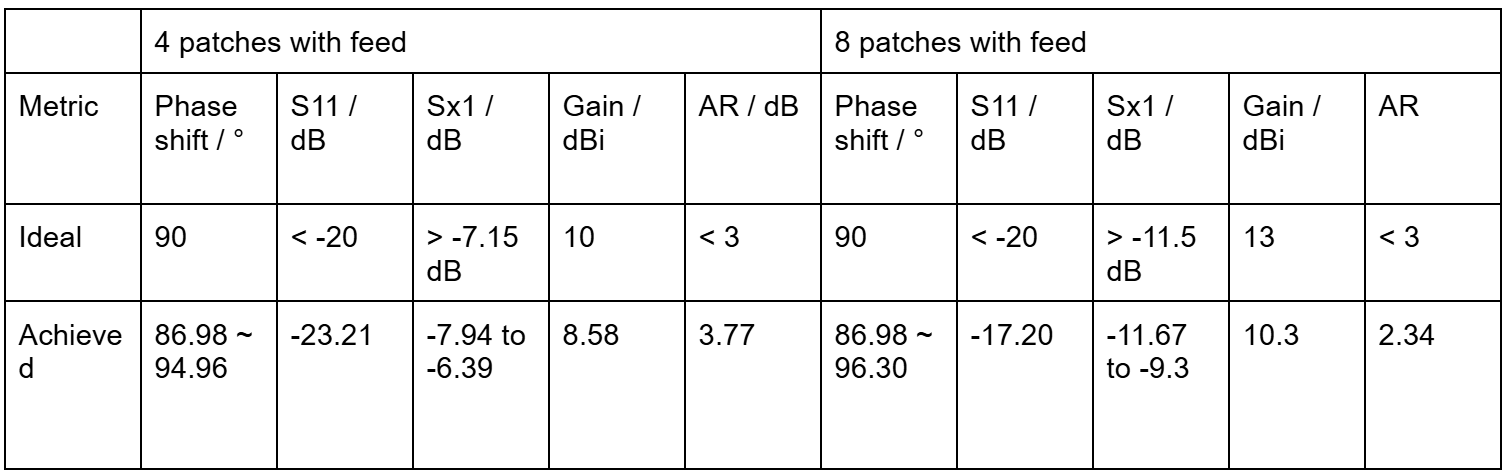 The final feed network (Fig. x) was created by copying the 2x2 subarray 4 times, with more T-junctions to feed each subarray from one source. An SMA connector footprint was also added on the feed layer for the power input. This design was simulated (Fig. x, Table x), all metrics satisfying the target, except the gain at +-12 degrees narrowly misses 8.5dB by ~0.2dB. This small variation was deemed acceptable as there is insufficient time to optimise it further.