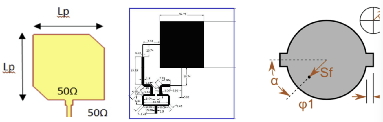 For conventional patch geometries, their fundamental dimensions are primarily dictated by the half-wavelength resonance within the dielectric substrate (Jackson, n.d.). For rectangular patches, the estimated size based on formulae [7] of one Ku-band patch element is about 7 mm x 5.2 mm. For a circular patch operating in its dominant TM11 mode, with radius of 0.293g, the diameter is about 7.6mm (“A TM31 Mode Circular Microstrip Patch Antenna”, n.d.). Taking the larger dimension of 7.6mm, and adding 10% margin to account for other geometric variations, we assume a 8.36x8.36mm patch.