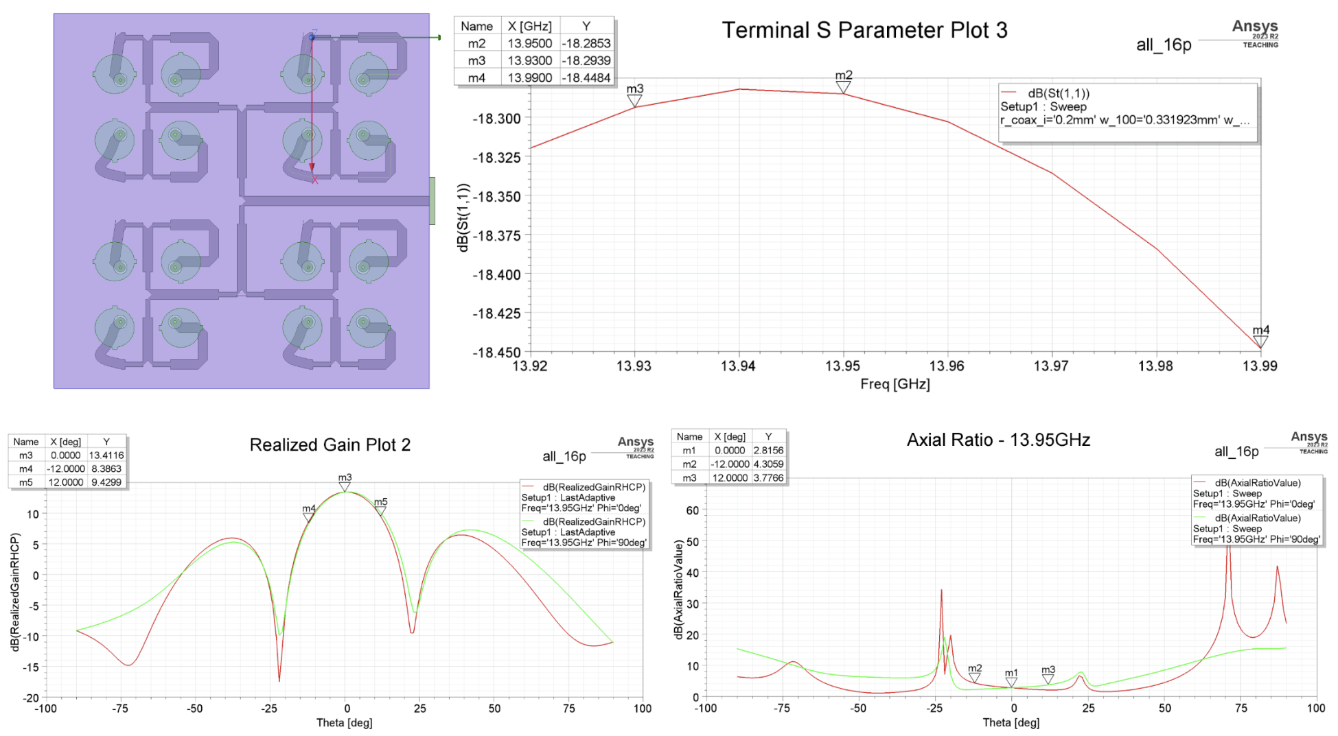 S11 (Return Loss) is the ratio of reflected voltage to source voltage. A lower S11 is desired because a small S11 value indicates that a significant amount of energy has been successfully delivered to the antenna rather than being reflected back to the source due to a mismatch (Ezurio, n.d.). Ideally, the antenna and source impedance should match at the standard 50 Ohms. The standard is to ensure >90% power transmission, corresponding to S11 ≤−10 dB (Verwilligen, 2015) in the operational range of 13.93-13.99 GHz.