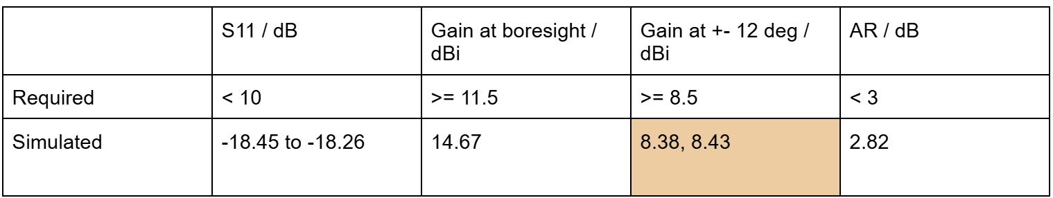 At this point, it was necessary to start fabrication for a functional prototype before the critical design review. The gain for 8 patches is now at 10.3 dBi. However, the target including a 50% margin is 11.5 dB. Thus, the array was doubled to 4x4. A gain of 13 dBi is expected, exceeding the target. For the gain at +- 12 deg, we will also target 8.5 dB, 50% above the required 7 dBi.
