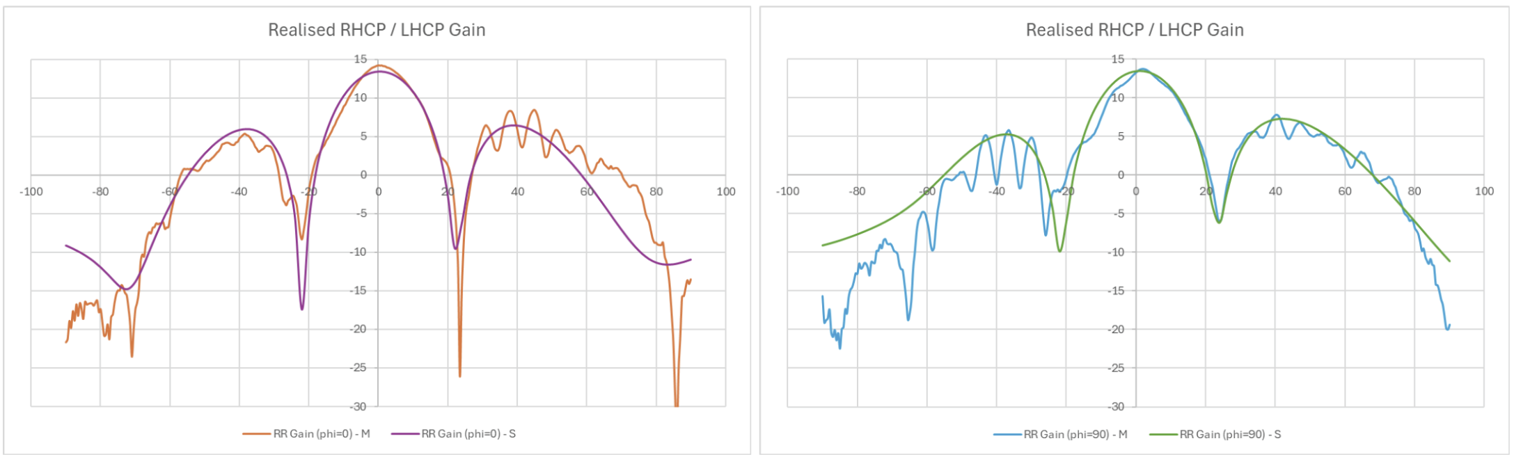 Fig x. Measured (M) vs. Simulated (S) Realised RHCP Gain for two x-axis cuts: phi = 0 and phi = 90 (see Appendix x)