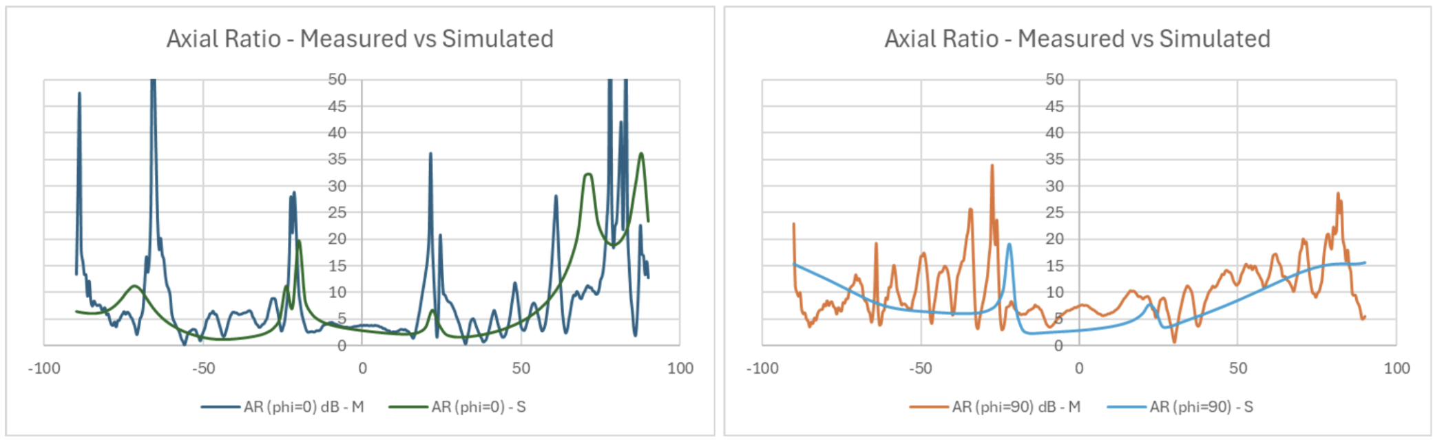 Fig x. Measured (M) vs. Simulated (S) Axial Ratio for two x-axis cuts: phi = 0 and phi = 90