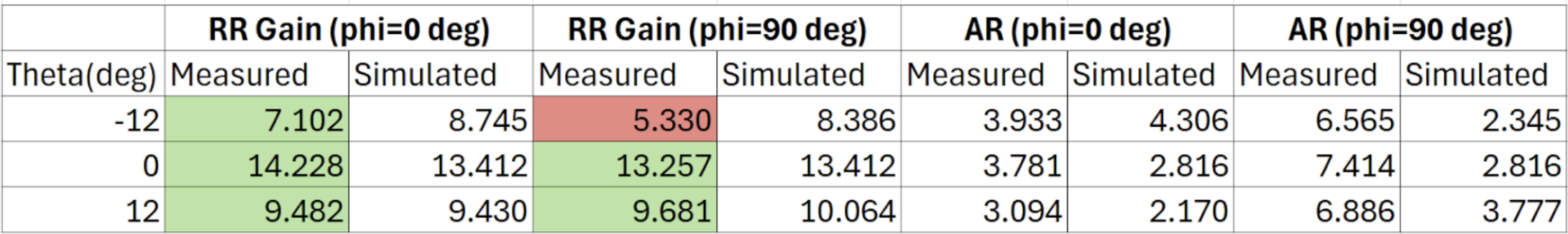 For the AR, the AR at phi = 0 was within 1 dB of simulated values, but at 90 degrees, the AR was as high as 7.4 dB which was surprising.