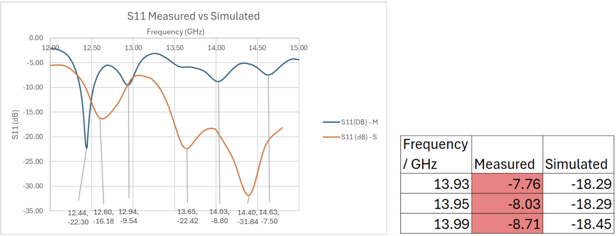 Fig x. Measured (M) vs. Simulated (S) S11, with minimums labelled; Table x. Measured (M) vs. Simulated (S) S11