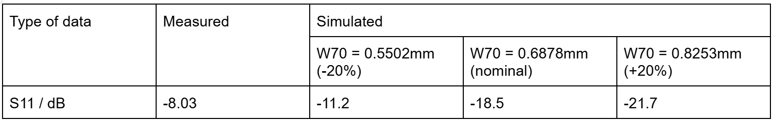 It is possible to simulate the manufacturing tolerances to check if the S11 and AR are worsened like in the measurement. According to PCBWay, for the 70.7 Ohm lines at width (w70) = 0.6878mm are controlled within 20%, which is +- 0.1376mm. For the minimum and maximum deviations, the antenna was resimulated. This verifies that indeed, the trace width tolerance of w70 could account for up to 7 dB of losses. The remaining 3dB of loss difference with the measured S11 can likely be attributed to trace tolerances for other lines such as the 50 Ohm line.