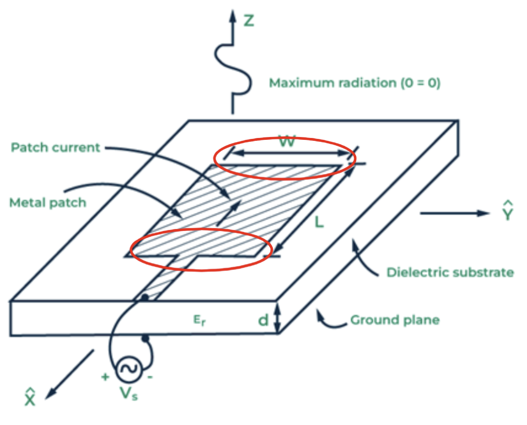 The patch antenna consists of a conducting patch layered on top of a dielectric substrate, which is on top of a conductive ground plane. Through a feedline, alternating electric fields are formed between the patch and ground plane, which resonate and escape through both ends of the patch antenna which act as radiating slots (Jackson, n.d.; Orban & Moernaut, 2005).