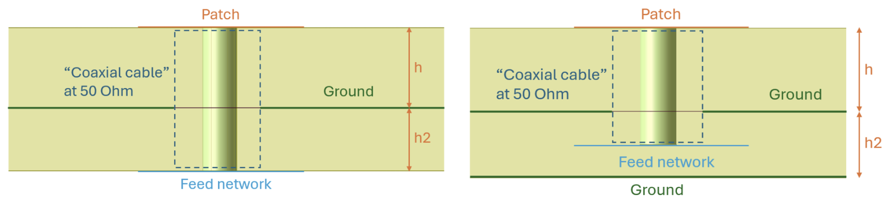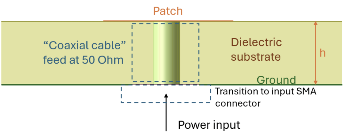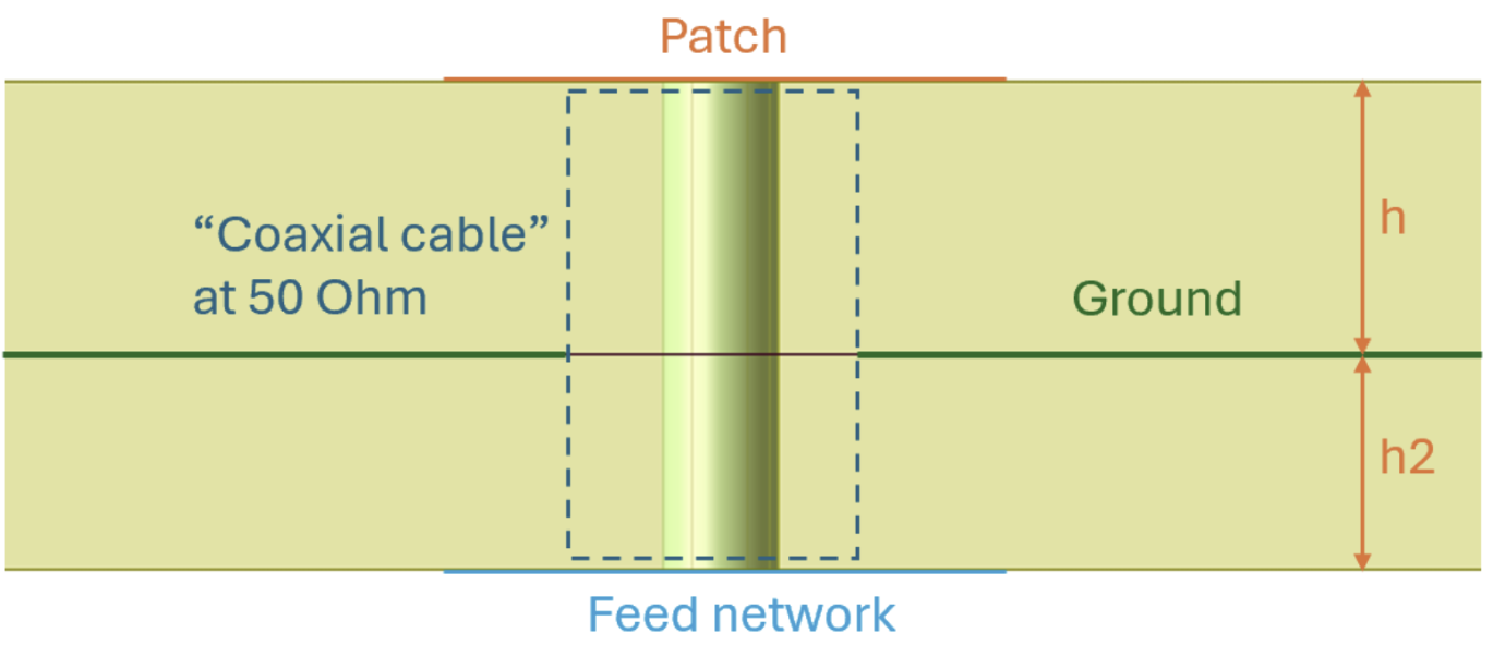 As mentioned in 3.4.1, a basic patch antenna consists of a patch layer, substrate and ground plane. As the circular patches are probe-fed (Fig. x), as compared to Fig. x, the feed is a via going through the substrate to contact the patch (Sowmya et al., 2012). For a singular patch, such a design (Fig. x) would be sufficient.
