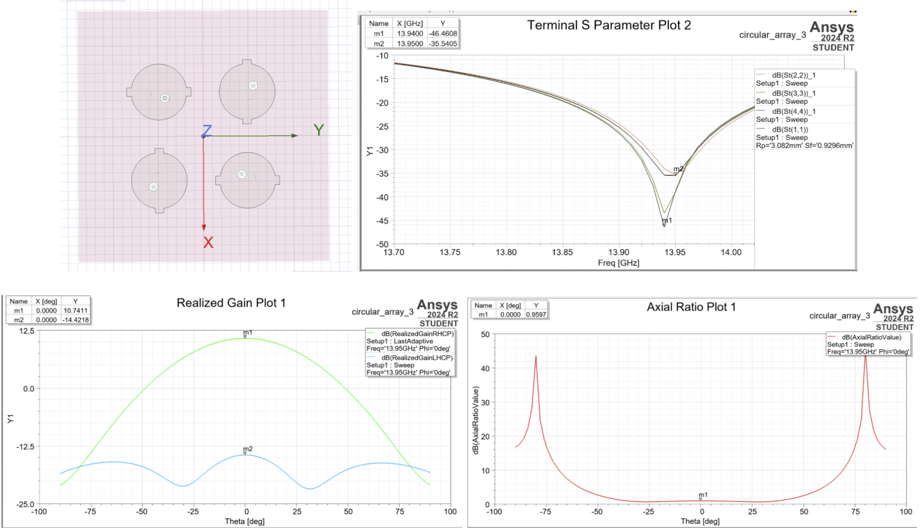 Axial ratio (AR) defines the quality of the circular polarization by calculating the magnitude ratio of the electromagnetic wave’s two orthogonal, 90-degree phase-shifted field vectors (Kuhlmann, 2023). It measures the polarization purity of the wave; ideally, the AR must stay below 3 dB to ensure high-quality circular polarization (Abulgasem et al., 2021). Since our system strictly utilises RHCP without LHCP receivers, AR is not so significant as realised RHCP gain, and is just a measure of polarisation efficiency. If two antennas share the same realised RHCP gain, they yield identical received power, but the one with a higher AR wastes some of the source energy in unutilised LHCP cross-polarisation (Denker, 2025).