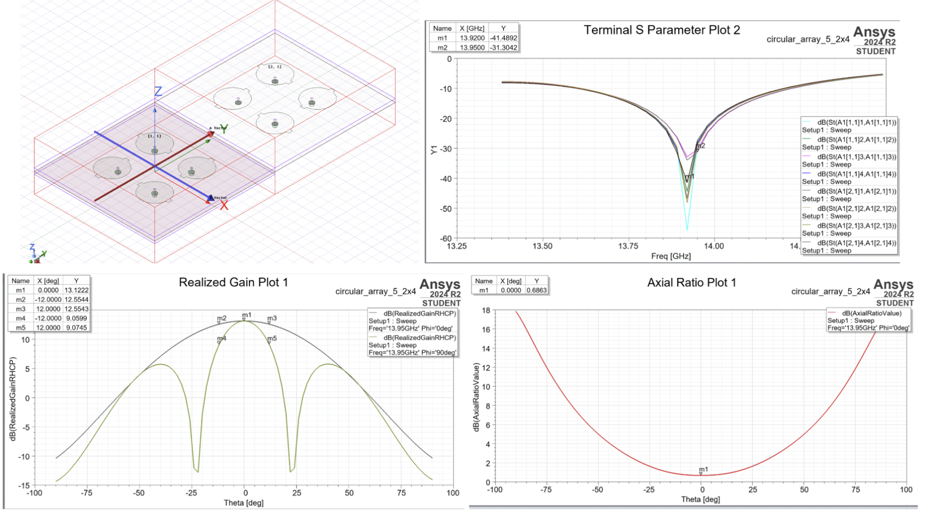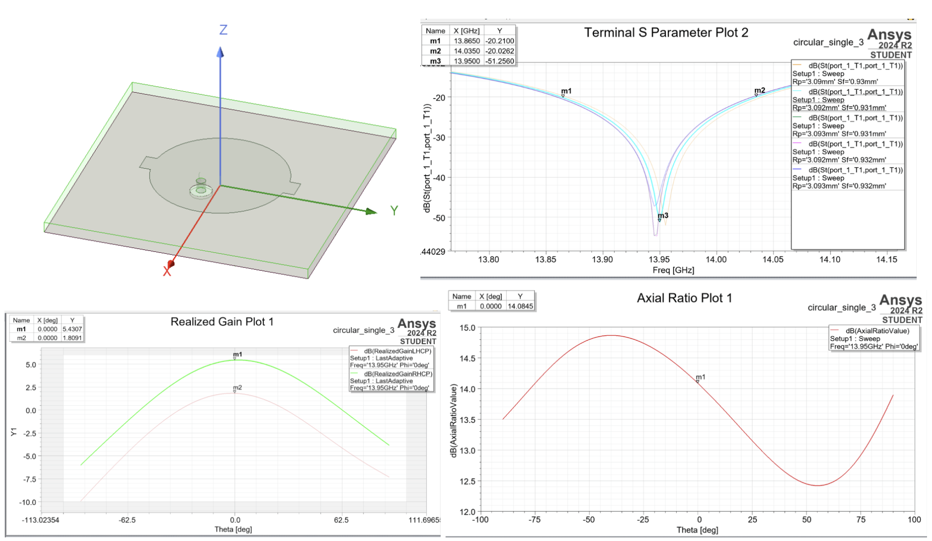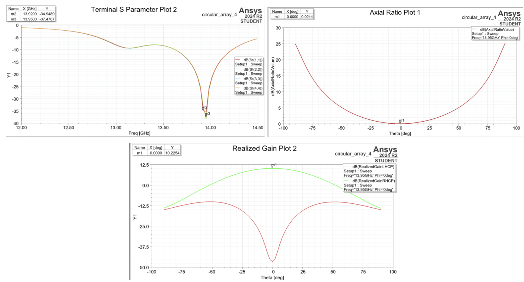 Axial ratio (AR) defines the quality of the circular polarization by calculating the magnitude ratio of the electromagnetic wave’s two orthogonal, 90-degree phase-shifted field vectors (Kuhlmann, 2023). It measures the polarization purity of the wave; ideally, the AR must stay below 3 dB to ensure high-quality circular polarization (Abulgasem et al., 2021). Since our system strictly utilises RHCP without LHCP receivers, AR is not so significant as realised RHCP gain, and is just a measure of polarisation efficiency. If two antennas share the same realised RHCP gain, they yield identical received power, but the one with a higher AR wastes some of the source energy in unutilised LHCP cross-polarisation (Denker, 2025).