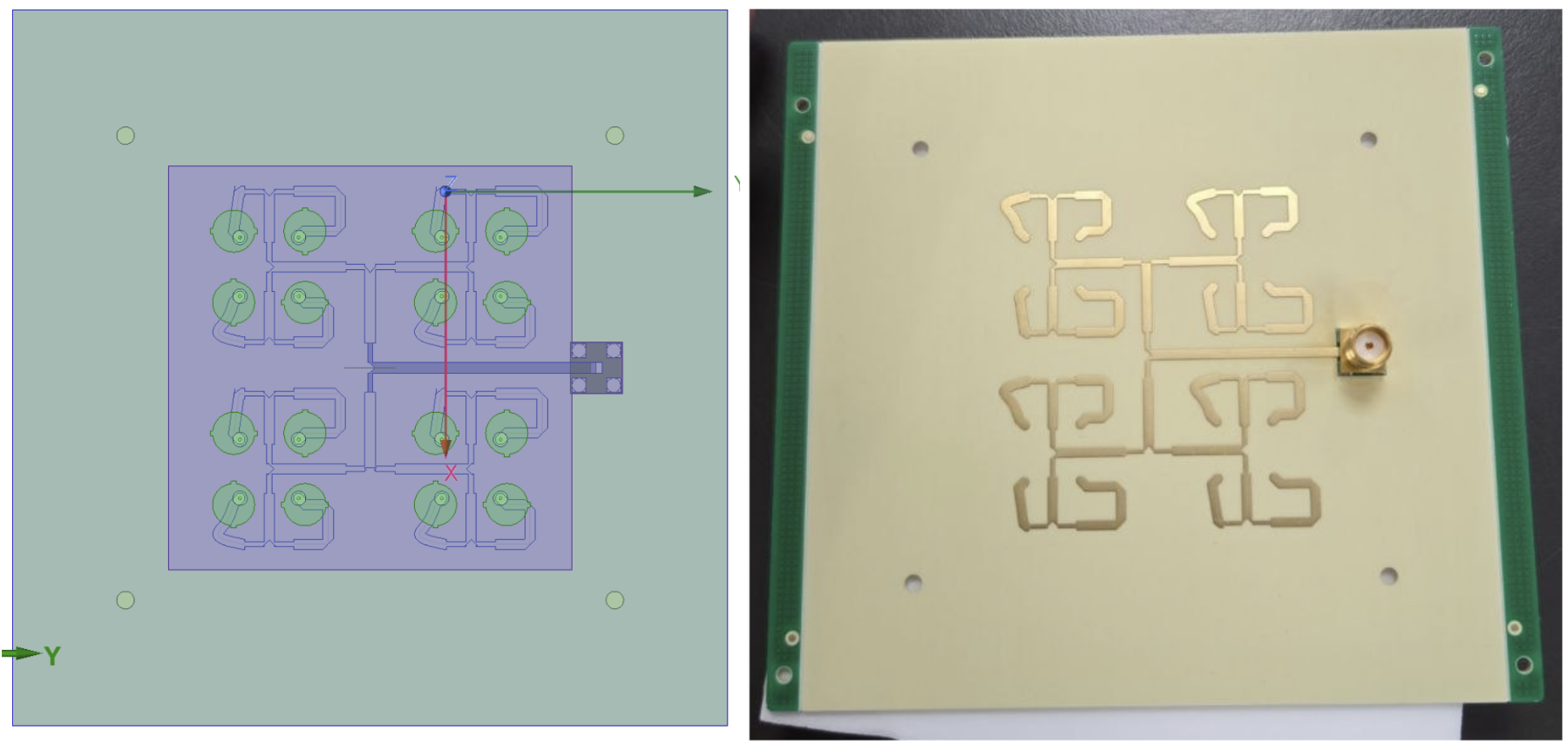 Figure x. a) Fabrication-ready design of antenna including mounting holes, SMA connector solder pad (left); b) Fabricated PCB bottom layer with soldered SMA connector (right). Note that a) shows the top-down view while b) shows the bottom view, thus why the feed network appears flipped.