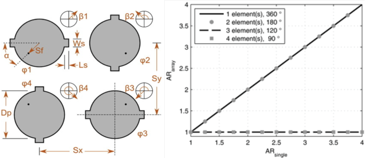 Figure 5. Circularly-Polarised Patch Array Concepts: (left) Sequentially rotated array of circular patches from CST Design Suite and (right) AR of n-element arrays (Kuhlmann, 2023)